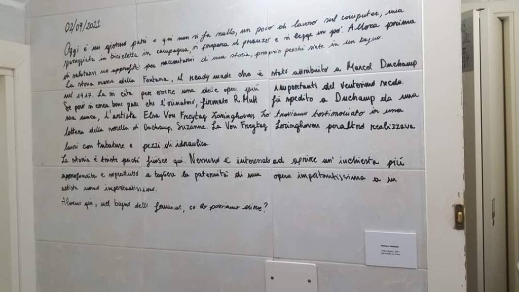 Stefania Cordone esegue un disegno sulle pareti dei bagni per donne di alcuni bar e ristoranti di Castelbuono. Il pubblico troverà testi scritti a mano dell’artista Stefania Galegati.