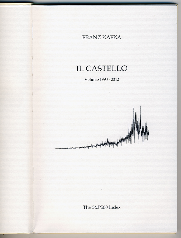 Chara Pergola choses Das Schloß by Franz Kafka, displaying the “Standard & Poor 500” stock market index as a frontispiece. The diagram becomes the icon of the hidden hearth of finance, driving our desires to an extreme peak in search of a top to be reached, and crashing down as soon as we try to get in touch with it.