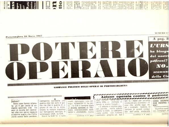 The heading is of the author’s family property, and the original cliché (used for the first issue of Potere Operaio, 20th may 1967) was reprinted for this serie. The work continues a series of actions and interventions on the family’s books (sCulture, 2007; Epifanie, 2006; Clausura, 2005). Cfr. pag. 862 de L’operaismo degli anni Sessanta. Da “Quaderni rossi” a “Classe operaia”, by Giuseppe Trotta e Fabio Milana. DeriveApprodi, Roma 2008, but also Con un piede impigliato nella storia, Anna Negri, Feltrinelli, 2009.